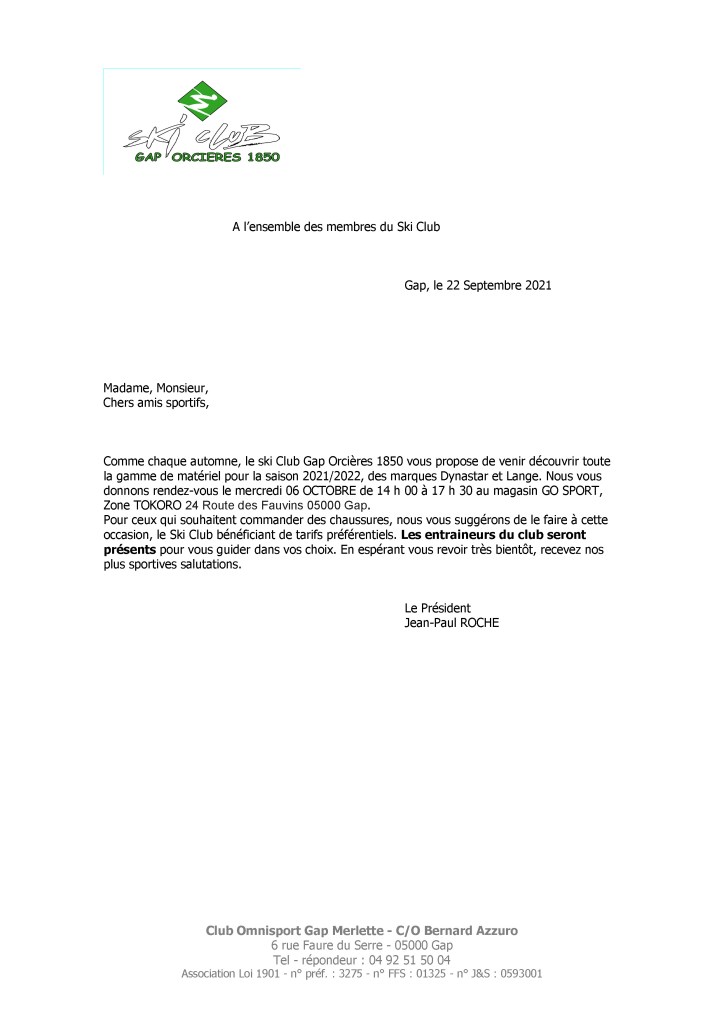 Une petite précision au sujet de la venue de Dynastar et Lange le mercredi 6 octobre après-midi, cette demi-journée est réservée aux enfants nés en 2012 et avant.